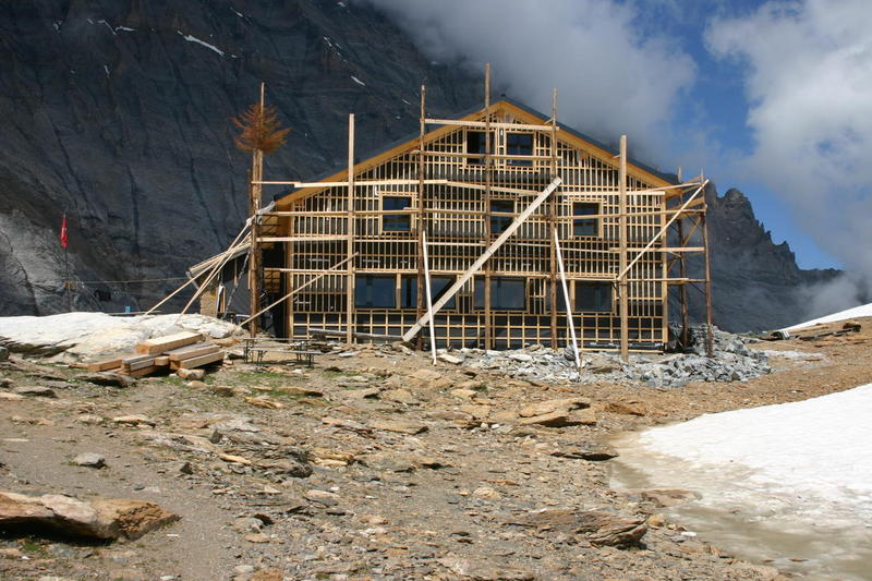 - The hut under construction in 2007, complete with the "topping out" Christmas tree:
