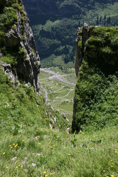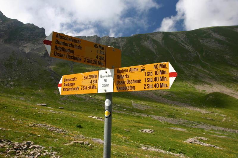 This walk starts and ends with the Allmenalp cable car. From the top station at Undere Allme, follow the path to the Ueschinental with its splendid views across the Kander valley to the Oeschinensee and the Blümlisalp range. Continue through Aeusser Ueschinen passing the Lohner Restaurant. About 10 minutes further along the Ueschinental, take the signed path to the right which zigzags formidably up the alp. It will take at least an hour and a half to reach the farm at Apschelen, gaining about 500m.