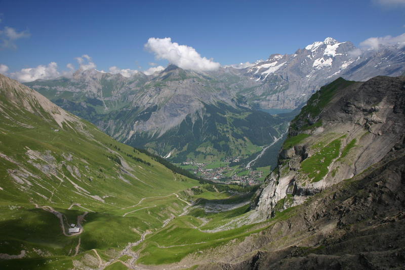 To get to Alpschelenhubel take the lower route which is signed as 30 minutes but took us more like 50 minutes, following an easy path across the high meadow. Above to the left you can see the Bunderschrinde pass over to Adelboden and the views along the length of the Ueschinental below, are stunning. On reaching the view point at Alpschelenhubel, there are magnificent views down into Kandersteg and across to the Oeschinensee.