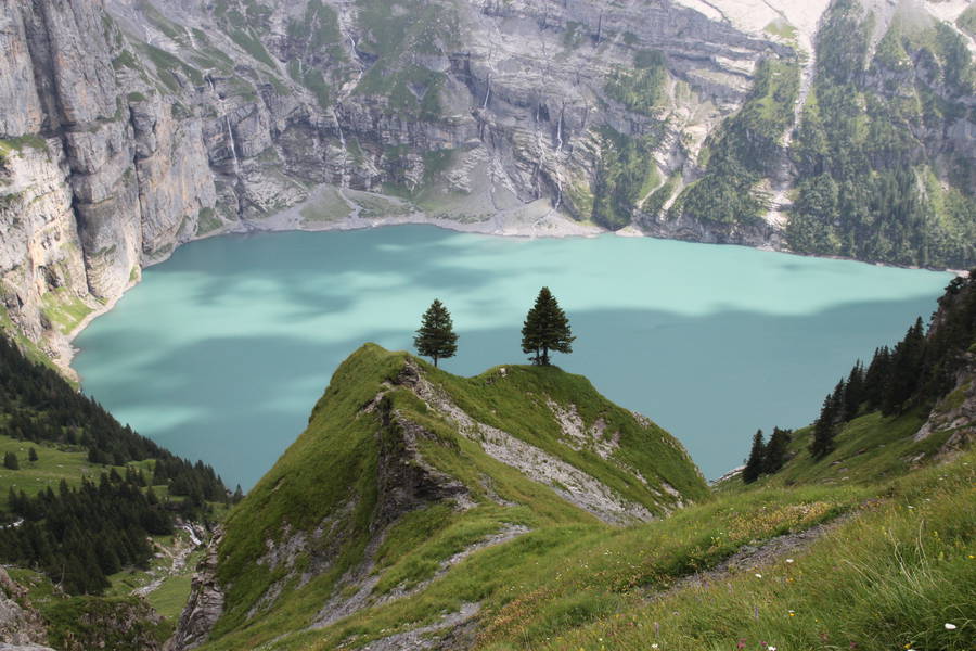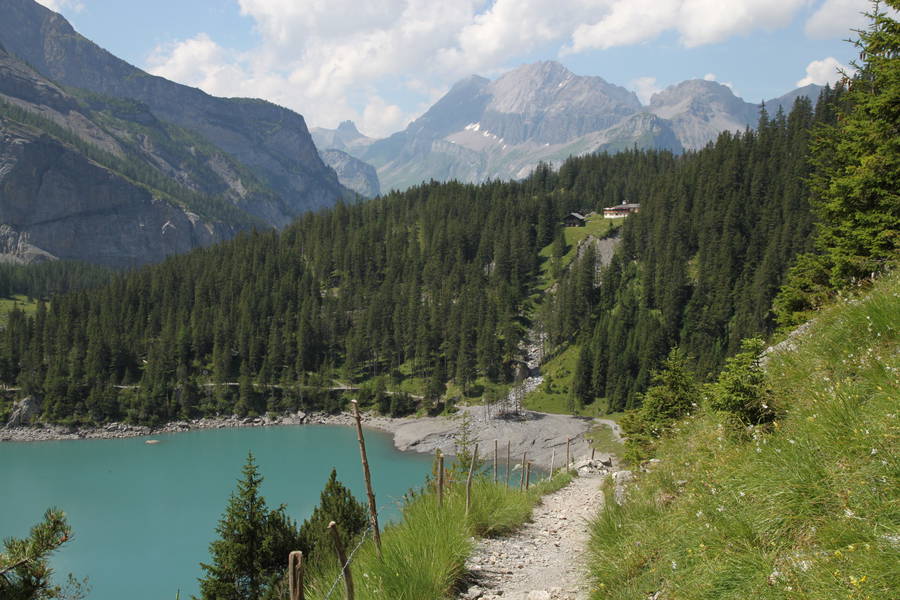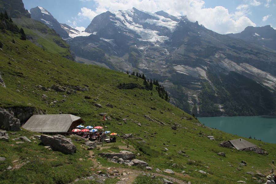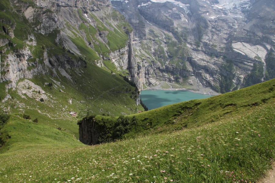 Leave Heuberg on the path which, after an initial slight ascent, makes a mainly horizontal traverse to the pastures at Ober Bärgli. It snakes in and out of the steep mountainside, passing several streams, and provides great panoramas of the lake from above. To the left are steep mountain meadows, ungrazed by farm animals and filled with flowers including globe orchids in July. The path finally descends slightly to the farm pastures at Ober Bärgli, populated by gentle cows in summer, and, after crossing a stream, reaches a junction with the path from the lake up to Hohtürli and the Blümlisalphütte. Turn right to descend to the lake; there is a restaurant just above the path. If you have your own provisions, a good place for lunch is on the cow-free meadow just a little way down on the right of the path. Below the meadow, the path descends a steep section by a series of steps which are well safeguarded with wire ropes. The Unter Bärgli pasture is then reached where there is another small restaurant. After crossing a stream, the wider path then traverses the cliffs above the lake, passing under overhangs in places, before descending to a signpost near to the lake shore. The upper path there returns upwards to Läger and the gondola station. Take the lower path near the shore to two restaurants and a window where soft ice creams can be obtained!