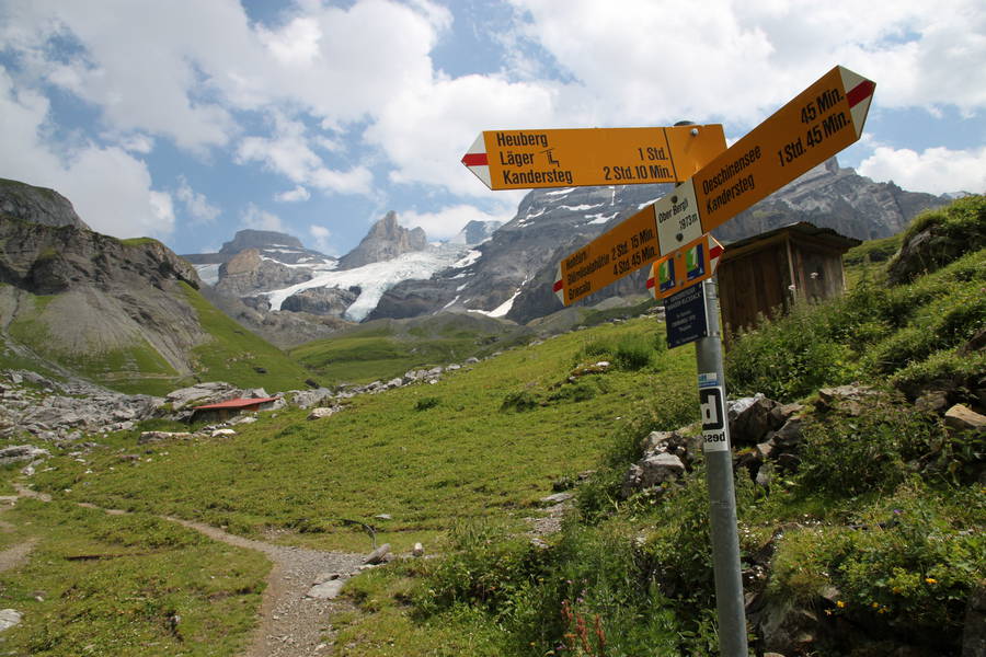 This is an easy day’s walk which is very scenically rewarding with views of Oeschinensee, one of the best and most popular Swiss mountain lakes. After an initial steep ascent, the walking is nearly all horizontal or downhill, though above Oeschinensee, the path is sometimes narrow and exposed. It is amply provided with opportunities to purchase refreshments and, on a fine day, you will encounter many people, particularly by the lake itself. Start from Kandersteg by taking a single up the Oeschinensee gondola; the path described involves walking back down to Kandersteg. Leave the restaurant at the top on the wide track to the Oeschinensee, but shortly afterwards turn left onto the upper path to the lake via Läger. You will soon encounter a signpost pointing upwards to the left to a path to Heuberg and Ober Bärgli. From there, it is a steep and strenuous, but not long, climb upwards to the wonderful viewpoint of Heuberg. There are two benches from where to admire the views down to the lake and across to the Blumlisalphorn, Frundenhorn and the Doldenhorn. This is the one stopping place where you will need to provide your own refreshments.