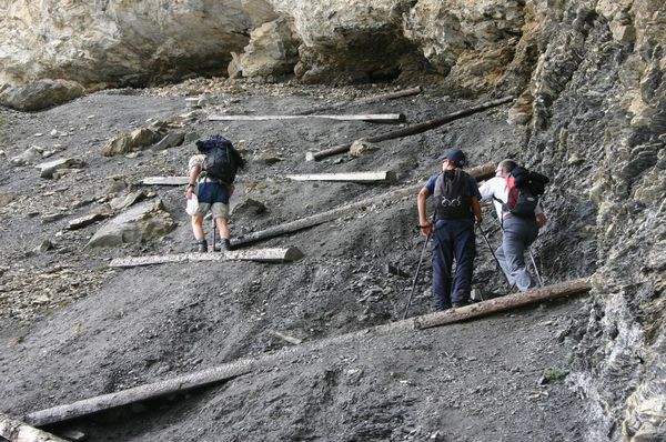 It is a good walk from the Griesalp over alpine meadow to Undere Bundalp and on to Obere Bundalp. From here it is between 2 1/4 and 2 1/2 hours up to Hohtürli pass, zigzagging over the lower shale path and finally up the steep rock path with occasional steps and rope hand-holds provided. The vertical rise from Griesalp to Hohtürli is 1370m with another 80m up the short (but steep) path to the Blümlisalphütte.