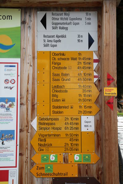 This walk starts at Gspon, along the Saas valley from Visp towards Saas Grund. In 2017, this started with the 07:42 train from Kandersteg to Visp, the 08:27 from the Bahnhofplatz towards Zermatt, arriving in Stalden-Saas at 08:51. From here, the 2-stage cablecar via Staldenried to Gspon runs roughly every 25 minutes, see