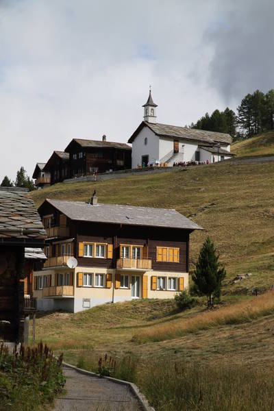 Follow the path through Gspon Village and past the church. The final destination is Kreuzboden but it tends to be spelled as Chrizbode at the Gspon end of the track. You will be following the Alpenpässe-Weg, long distance path Number 6, for most of the route so watch for those signs. You are walking towards the Mischabel Range of Alps, above Saas Fee, the last bastion that separates Switzerland from Italy around here. The path wanders fairly gently through trees and meadows until it reaches Oberfinilu.