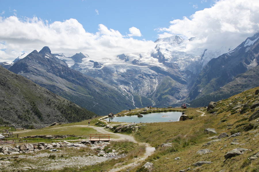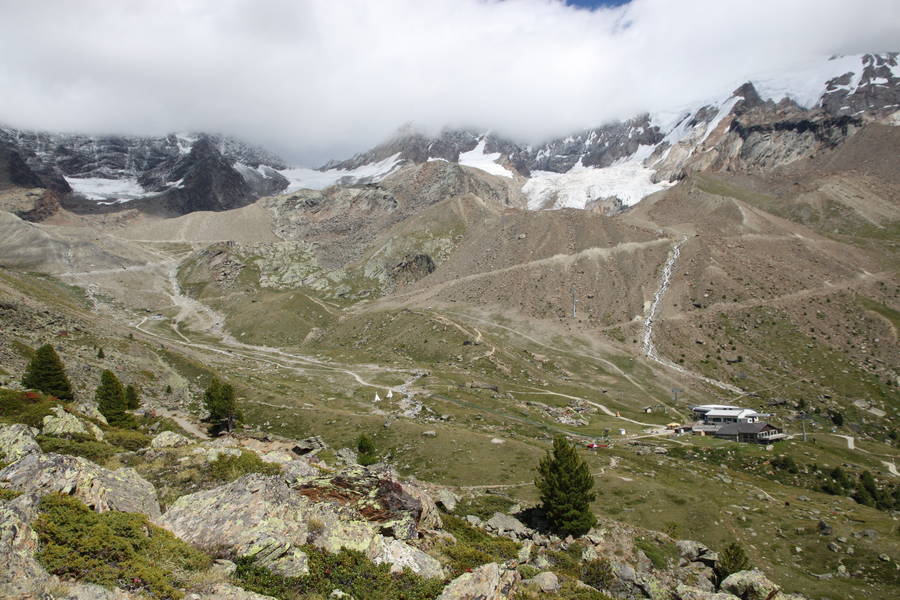 Descend to Kreuzboden with it's lake, gondolbahn station and restaurant. The panorama of peaks above Saas Fee are to your right.