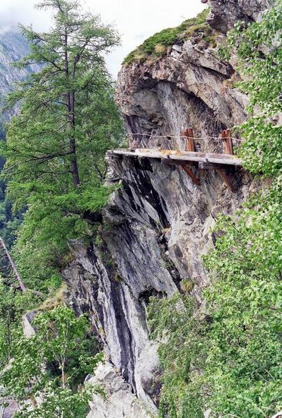 Start from Kandersteg railway station and take the train through to Goppenstein. This is now a stopping train so stay on it through to Hohtenn which is the start of the Höhenweg Südrampe. Go down the road, following signs for the Höhenweg Südrampe BLS - the steep rise after going underneath the railway is probably the steepest part of the whole walk! After a good hour the path arrives at Rarnerkumme where there is a restaurant and good views over the Rhone valley; you are largely following the railway - sometimes above and sometimes below. Continue for at least another half hour to Riedgarten where a number of stone tables and benches might provide an early lunch spot. This section includes the Bietschtal viaduct which you approach through a series of tunnels hewn out of the mountainside; a set of steps takes you up to the level of the railway and the path lies directly alongside the track.