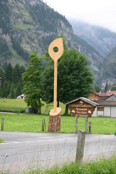 The walk starts along the main road towards the end of the valley but turn left to the Waldhotel Doldenhorn (by the big wooden spoon!). The path starts at the end of the road and climbs steeply through the forest with occasional glimpses back down into Kandersteg. As you near the top of the climb the alpine flowers are abundant with particularly good Alpenrose and Aquilegia. When you reach the avalanche protection, turn right at the hut at Fisischafberg to go to Jegertosse - it's about another 20 minutes.