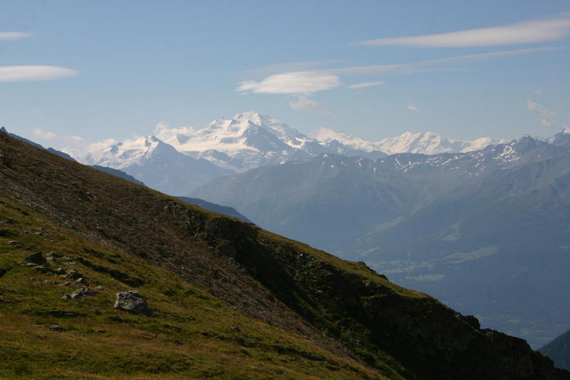 There is a hard 20 minute climb initially to get to Stafel above the cable car station. The path then wanders through flower-strewn alpine meadow with terrfic views of the Lötschental mountain range. After a fairly strenuous climb you reach a plateau with a welcome seat. The scenery now changes from alpine meadow to a more sparse, boulder-strewn region. It is about 70 minutes from here to the Lötschenpasshütte, crossing the remnants of a snow field before reaching the hut.